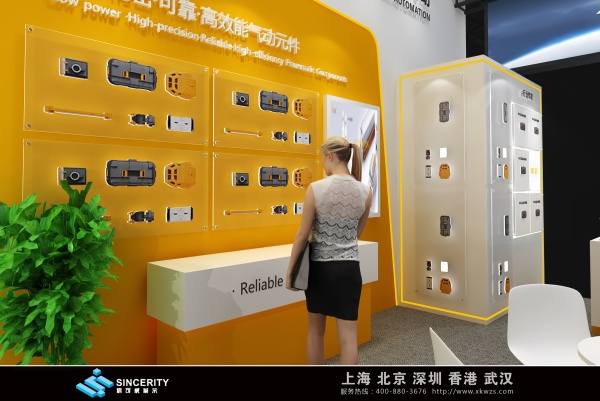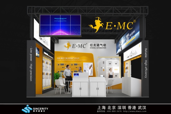 億太諾展會設計以白色和黃色為主色調,營造出明亮、專業的氛圍,展會的頂部和正面都有顯眼的品牌標識 “E?MC 億太諾氣動”,并配有標語 “行業高端氣動元件制造商”,突出了品牌的定位和理念。
