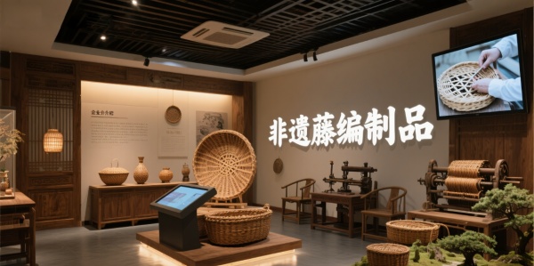 色彩運用主色調:原木色(自然與溫暖) + 米白(簡約優雅);漸變效果:淡綠色墻面,展示藤編的自然氣息。設計元素材質:老藤材(歷史感)、天然纖維(工藝載體)、互動屏(展示藤編過程);符號提煉:將藤編的紋路放大,作為空間隔斷。場景化模塊文化長廊:光影展示藤編歷史,觸控屏提供詳細信息;體驗區:提供仿古編織機,讓觀眾親自體驗;產品展示區:微型藤編園景觀,展示藤編藝術與自然的結合。