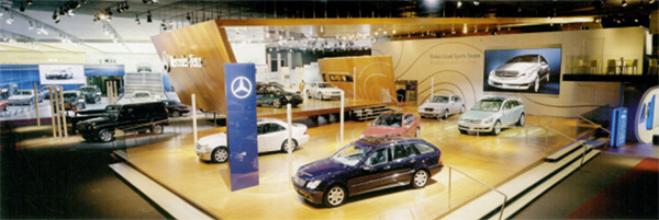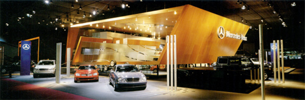 梅賽德斯-奔馳公司展示空間設計由辛德勒建筑師事務所設計,該展場的設計是三面敞開的空間,剩下一面則由另一個參展商的展場界定。梅賽德斯一奔馳公司的展場由一個可供穿行的雕望體和各式各樣的展示地板所組成,從展場中心能很容易地到達任何一處。